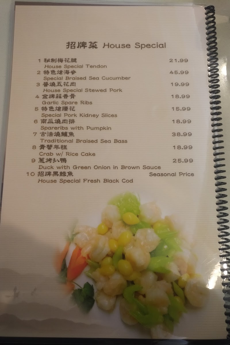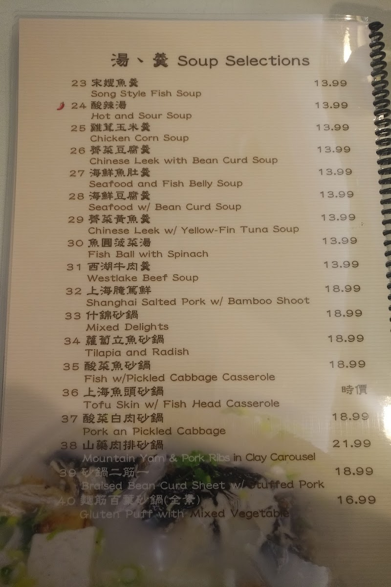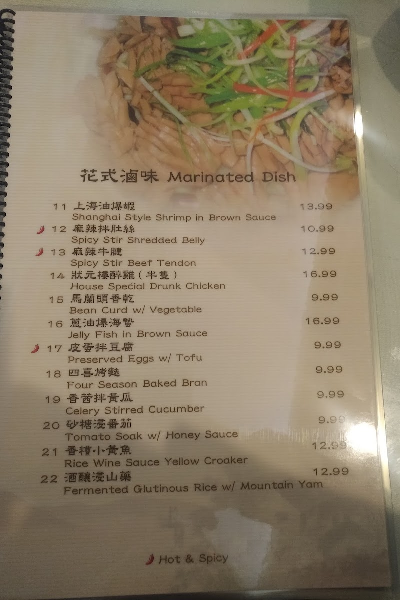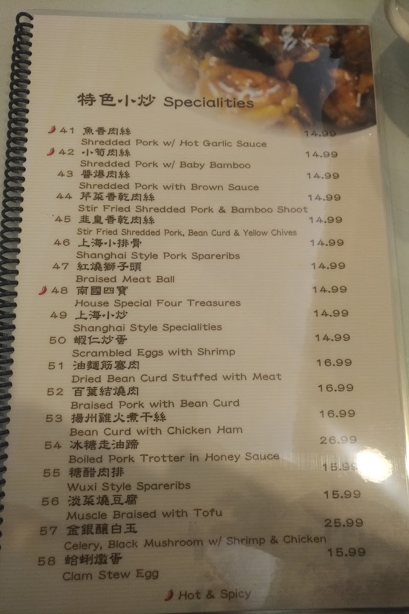 The menu at Southern Mini Town Restaurant offers a diverse selection of flavorful dishes that capture the essence of traditional Shanghai cuisine. The vegetable section features dishes like Eggplant and String Bean in Brown Sauce and Eggplant with Garlic Sauce. For tofu lovers, there’s Bean Curd with Black Bean Sauce and Home Style Tofu. In the house specials, the 秘制梅花腱 stands out as a must-try. For marinated dishes, the 上海油爆蝦 (Shanghai-style shrimp) and Preserved Eggs with Tofu are notable favorites. The chicken, beef, and lamb options include the rich Kung Pao Chicken and Black Pepper Beef, along with the flavorful Three Cups Chicken. Noodles and rice dishes such as Shanghai Thick Noodle Chow Mein and Chinese Leek and Pork Rice Cake offer satisfying meal choices. Specialties like Fish Fragrance Pork Shreds and Shanghai Style Pork Spareribs bring unique tastes to the table, while soups like Hot and Sour Soup and Chinese Leek with Yellow-Fin Tuna Soup are perfect for warming up. For a special treat, try the Shredded Pork with Hot Garlic Sauce or the House Special Drunk Chicken. The menu also offers dishes like Spicy Stir Beef Tendon and Rice Wine Sauce Yellow Croaker for those looking to explore bold flavors. The wide range of options ensures there's something for everyone, from meat lovers to vegetarians, making this restaurant a great spot for a hearty and satisfying meal.